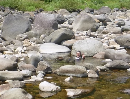 | 長良川温泉に浸かる和人君。しかし暑かったですね。このエリアは比較的空いていました。 |