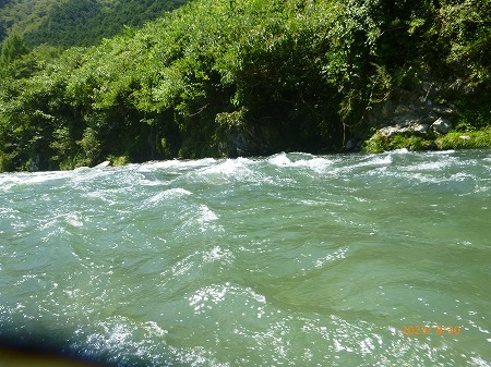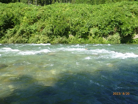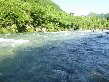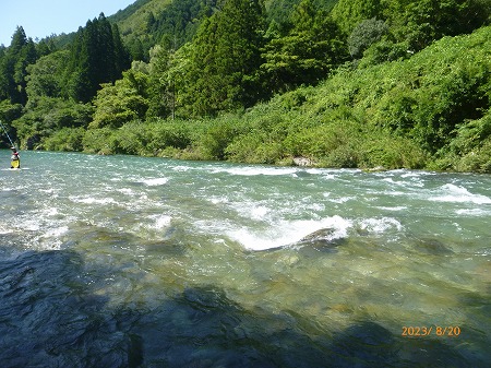 エリアは徒歩圏内。広瀬橋周辺が狙い目ですが、おとり配布がビリから2番目だったので入れないなと思い漁協下流のつり橋を渡って堰堤下を目指しました。しかしここも既に先客3名。戻って上流へ。大滝というポイントを目指します。降り口が分からないので教えてもらって到着。もう汗だくでヘロヘロ。いい瀬が見えてきた。降りたところに斉藤師匠が居たので木陰で休んで拝見。「高水で奥まで差せんで、ここやりゃぁ」と場所を譲ってもらう。クールダウンも出来たのでやってみる。