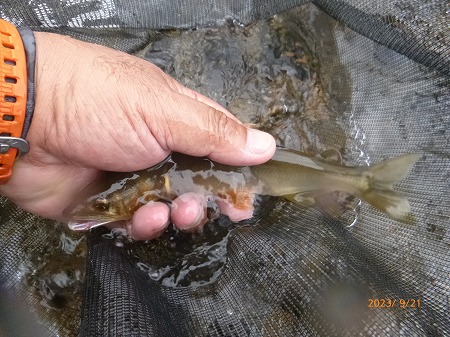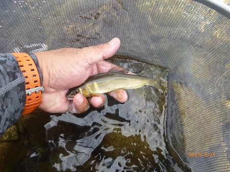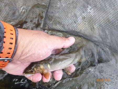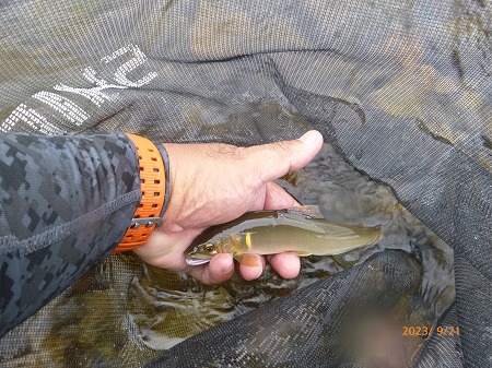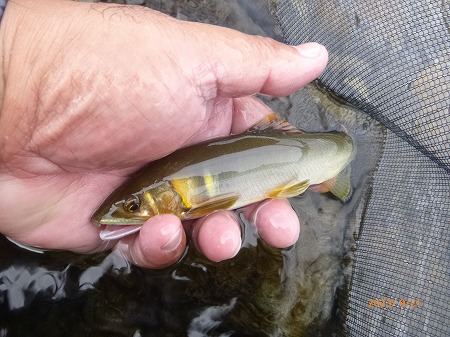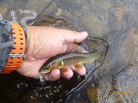 | 年に一度の健康診断。体重変化なし。視力が年々落ちている。朝イチの予約で9時過ぎには解放される。天気はイマイチだが大内山へ走る。11時前、最下流部専用区「おとべ」へ。釣り人は5名ほど。昨夜の晩飯からなにも食べてないし、アルコールも抜いたのでここはプシュッとゆっくりやってから川へ。釣り人は上流のトロ場狙いの方が多くて、瀬肩に一人だけ。瀬とその下流は無人。渇水なので水深が有る瀬落ちからやってみる。丁寧にゼロテントレース!掛かった。18p位のまっ黄色!ええ感じやんか!替えて出すと即掛かり!でビリ。替えてまたすぐに3匹目!背掛かりで良いサイズっぽいぞ!水中糸に葉っぱ引っかかっとる?プチン!また悪夢のドンブリ。複合のメタマグナム005でしたがあっけなかった。そこからやっぱりリズムが崩れる。下流へ移動しながら探るが追わんぞ。たまにビリで黄色い奴がいません。下流の瀬に行く。渇水でしょぼい流れですが、流れに入れるとシュパーン!ときた。18〜20p位が5匹ほど掛かった。いいおとりで緩い流れやトロ場を探るが掛かっても小さい。最初の辺りに戻って丁寧に探るとポツポツ掛かるようになった。引くとダメで、瀬の中で丁寧に泳がせると良いヤツが掛かる。瀬尻付近の釣り人はコンスタントに掛けている。夕方、上の瀬肩で夕食みを狙う。瀬肩で掛かるが小さい。瀬流芯を探るとドキューン!素晴らしい当たり!黄色いヤツが連発する。どこにおったん?って感じです。5時半までやって31匹。ビリはおとりに使ったものだけ舟に入れています。使わなかったビリは5匹くらい。20p位のが7匹、後は19p以下。思った以上に楽しめた大内山でした。 |