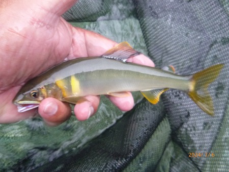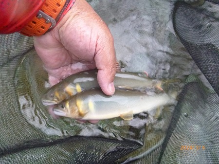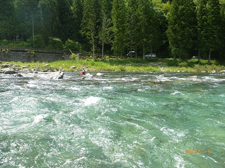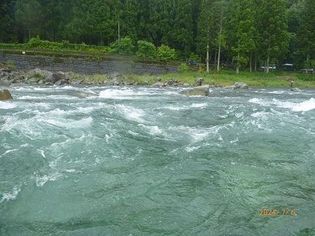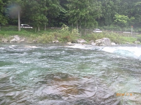 | 延期になった報知オーナーカップ馬瀬川大会へ。土曜日の大会をまず見学。垢が薄いですが、薄い石にも鮎がしっかり付いています。残り垢の黒い石周辺の方が鮎は濃いような感じ。濃い所と薄いところの近接するような流れが良いようです。1時間ほど見学してお土産確保へ。 神垣内さんでおとりを購入してどこがいいかを尋ねると下流西村地区の水辺の館付近がサイズが良いよ、とのことで素直にそこへ。初めての場所です。右岸も左岸も川へのアプローチがしやすい所なので釣り人は大会並みの混雑です。しかし皆さん左岸筋の残り垢を中心に攻めていて、右岸筋のキツイ流れは無人。大好物がやり放題。 10時過ぎ、よだれを垂らしてそこへ。右岸岸際しか立てません。崩れた木組み沈床があり、鉄筋が所々残っていて危ないです。掛かっても慌てて下ったらダメだな。最初からキツイ流れにおとりを入れます。ドドーン!やっぱり居ますね〜。掛かる筋と掛からない筋が有って、掛かる筋では数匹掛かります。良く肥えた良い鮎ばかり。楽しぃ!昼近くになり空が暗くなってきた。ヤバい!朝見学中に汗かいた服を木陰に干していたので焦って上がります。ギリギリ取り込んだところで本降りの雨。昼休憩して13時過ぎにカッパ着て再開。皆さん待機中だったので左岸側の黒い流れも触ってみます。瀬肩の良いところで3連発。しっかり鮎居ますね。小降りになるとまた釣り人が湧いてきました。午前中やった右岸筋の上を見に行きました。老田屋さんという民宿が上に見えるところです。いい瀬ですがここは誰もいません。ちょっと触ってみます。黄色いですが2サイズダウン。やりやすいところは小さい。瀬のド芯狙いに切り替えるとサイズアップ。15時までやって35匹。小型は10匹程度。ほとんど17p以上で大きいのは20p位。いい感じで楽しめました。 さて明日への考察です。午前中は最近気に入っている満開チラシを使いましたが、どうも追う範囲が狭くて強いようで、メリットを感じませんでした。午後は一角7.0号4本錨に変えてバッチリでした。馬瀬川のようなポイント(石)がはっきりしている川では錨、ベタ流れでポイントを探っていくような流れではチラシが良いように感じます。河川の状態は、残り垢は十分。新垢は5〜8分といった感じで、残り垢エリアの方が鮎は多いようです。ですが新垢にもしっかり鮎が付いていて、狙えるのであればその両方がある流れを狙いたいですね。あと同じような瀬でも鮎が居るところといないところがあって、イマイチ見分けが付きません。これには打っていくしかないな。垢が無いように見える流れでも白泡絡みでは結構追いが出ました。最後はまあどこの河川でも共通ではありますが、おとりがちょっとでも浮くと極端に追いが悪くなりますね。しっかり底に入れることがキモのようです。さて水が冷たくて冷え切ったので温泉へ!下呂桃庵さんでチャージ完了! |