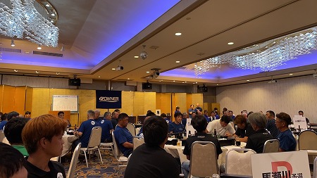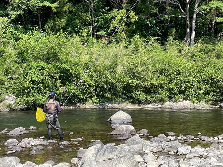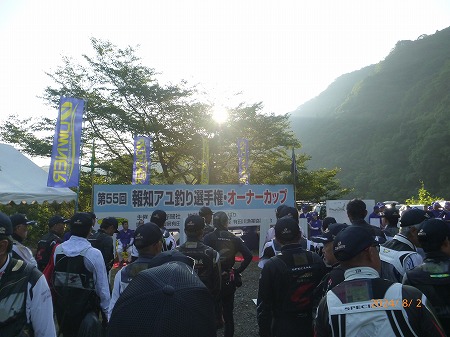 | 大会当日。名人がいっぱいで華やかですね。1回戦は96人もいます。各24人の4ブロックに分けて各ブロック8位タイまでが勝ち上がり。今回の戦い方は、水深が有る通った流れで追う鮎を狙う!必殺アイテムは極細タングステンメルファTG0.03号! ブロック抽選は@-16番目。四村川合流点の岩倉橋から下流付近です。初めての場所。駐車場から配布場所まで川を確認しながら歩く。下流部はほぼトロッパで釣り場じゃない。その上が木々で見えないが瀬があるようだ。 おとり配布場所へ降りる。上流は開いた瀬が多い感じに見えた。狙うは下流だな。おとりは自分で選びます。8時スタート、10時帰着です。大きな石が点在するトロ場から少し絞った流れ、小さいガチャガチャが落ちて良い感じのタナ、そこから開いて大トロ場です。思っていたより瀬が短い!先行者が押さえてしまい、行き場を失った。タナとタナの間のガチャガチャしかない。おとり替えは出来そうに感じたので、良いおとりが取れればトロ場狙いも有りかと考えてやってみることにした。自分が探れそうな範囲は10mもない感じ。空中輸送で瀬に落ちる手前の岩盤にある1畳ほどの坪を狙う。ゴニョゴニョっと1匹目。割と早かった。溜まっている感じなのでもう一度同じ坪。シュパーン!と掛かったがバレた。居るな。しかし追いが無くウロウロするだけ。 瀬落ちの開きに入った西部パパはバッチリスタートダッシュを決めてバンバン掛けている。そのタナに落ちる手前のタライほどの坪を狙う。根掛かり。外しに入り最初に狙った坪の落ち際ギリギリにおとりを入れてみる。手が届くほど近い位置です。ドカーン!良型まっ黄色が残っていた。ええのが手に入った。これを持ってさまようかと考えたが、立ち位置上付近の小さいタナ尻岩盤にも鮎は見えている。選手がかなりの密度なのでまずはここを探ってからだな。ビンビンおとりで攻めてみると調子よく掛かった。立ち位置極手前1m程でも掛かる。トイにある石横10pを狙うとギュイーン!この日最大が追ってきた。 自分に与えられた範囲が狭いこともあって、普段の10倍くらい細かく探ったことでうまく掛けることが出来て込み9匹。残り30分で移動する。上のザラ瀬付近を目指すが入れそうもない。ザラ瀬の尻で遊び鮎を狙う。1匹ビリを追加して終了。込み10匹は4位タイでした。トップは西部パパが17匹でぶっちぎりです。 本部へ戻って休憩する間もなく2回戦抽選。次はB-3番目。8名で4名が勝ち上がり。半分なら頑張れそうだ。同組には直前に白石付近で開催されたシマノセミファイナル優勝の島名人やガマの谷口名人もいて気後れしそうですが、始まってしまえば自分の釣りに集中するだけ。 エリアは植木橋という吊橋の上辺りです。ここも初めて。配布場所から上がトロ、その上に瀬が見えます。下流は二股に分かれたしょぼい瀬。下はトロです。上がよさそうでしたが先行2名が上へ行かれたので選び放題の下の瀬へ。トロ落ち込み上が釣り返しも効くだろうと行ってみました。右岸側流れのトロへ落ちる前の小規模なタナです。 試合開始。波気ですぐに1匹目が掛かった。これはいいぞ!替えて落ち口ギリギリの岩盤へ滑り込ませると1発で追ってきた。開始5分ほどで2匹目。自分にはこれ以上ないスタートを切れた。しかし止まらない異常な汗。焼けた中州からの釣りなのでツライ。そして悩まされる根掛かり。針が刺さる石が多い。これでリズムが崩れる。中洲の水たまりでおとりを替えたり仕掛けを整えたりしていると焼けた石の熱源に近いからか余計にアツい!凍ったアクエリアスを飲むが、溶ける量が少なくて追いつかない。 スタート時島名人が攻めていた左岸筋落ち際のタナは岩盤だが鮎が見えている。いかにも掛かりそうだ。入れてみるとギューン!よし!んが!バレた!1試合目も調子が良かった満開チラシがここにきてバレた。一角4本に変える。バキューン!掛かった!またバレた!左岸向きに立つと後頭部に日差しがガンガンくる。段々と頭痛が。ん?左腕が痺れてきた。こりゃアカン。熱中症なりかけや。 クールダウンのために水に浸かりながら狙うようなポイントがない。完全に集中力切れて、エビになって仕掛けも切れる。ついに腕がプルプルしてきたので諦めた。30分残して上がる。検量を申し出るが、皆一緒に検量を行うので川に浸かって待っててくださいとのこと。ツライ。検量3匹ドベで初のオーナーは終了。トップはトロ場をデカ針泳がせで完全攻略の谷口名人が14匹でした。体調不良はどうも塩分が足りていなかったようです。ドリンク2本持ち位で挑まないとダメでしたね。1日目残り試合は見ることなくコンビニへ行って氷喰って水分塩分アミノ酸補給して宿でシャワーして養生しました。 夕方、オーナー主催の懇親会へ。大きな会場で予選会場ごとにテーブルがセット。アルコールは出ませんが、食事を頂きながらベスト16の表彰やベストエイトの組み合わせ抽選が行われました。なんと同じ馬瀬