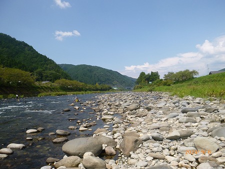 大会当日。参加者112名、1回戦は6:30〜10時まで。3時間半×3=10.5なので込み13匹以上を目指す。狙いは石色がキレイなところ。水深、流れの強弱はその次と考えてやってみる。入川くじは下流の真ん中より後ろ。変化が多く動ける杉ケ瀬やな下流を目指し大汗かいて歩く!前日良く掛かっていたタナに陣取った。