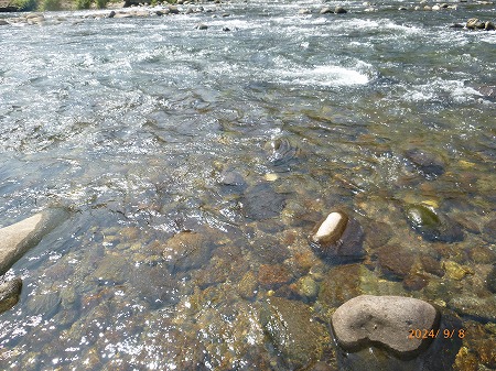 護岸際に立って開始。掛かったが小さくて白い。追っていない。昨日掛っていた時間にはまだまだ遠い。でも居るようなので粘ってしまった。逆光で見えていなかったが、日が差すと石色悪い!昨日と全然違うやないの!失敗だ。残り1時間で多分込み8か9位。どう動くか思案する。少し下がって深瀬狙い。おもりを打って沈める。スコーン!と掛かった。大きくないが追い鮎だ。気配も十分感じる。バレもあったが5匹追加出来た。込み14匹で1回戦は通過。ボーダーは13?だったか。