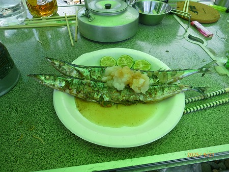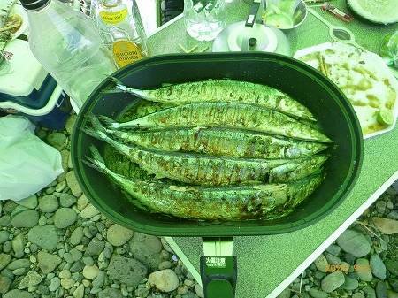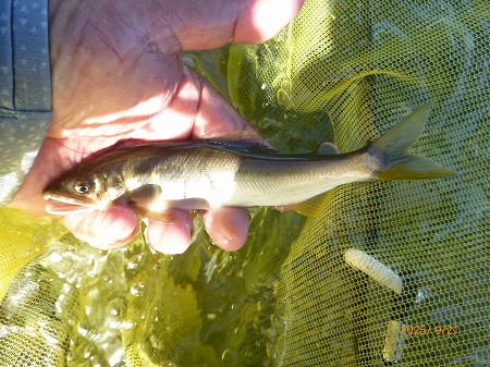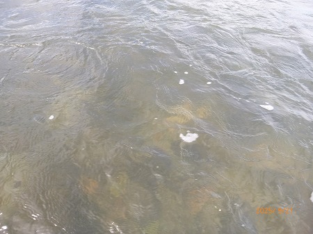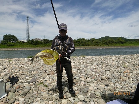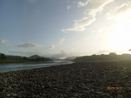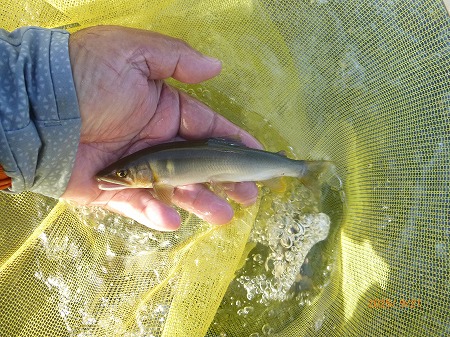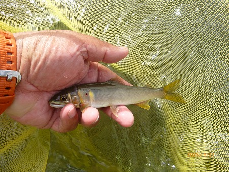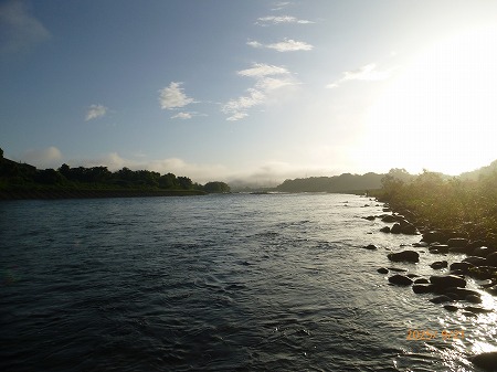 | 中央戸田裏で例会です。三重では夜半に激しい雨が降っていましたが大丈夫かな。朝6時頃に到着すると水位は上がっているものの濁りはほぼ無くて出来そうではありますが、郡上が増水濁り有りらしいのでそのうち到達するでしょう。出来る時間が少ない予想なので7時前に川へ。前日和人君が45匹位仕留めた天然元気鮎を4匹強奪して下の瀬肩へ。前回良かったヘチを丁寧にやってみますが気配なし。掛かったのは白い鮎。縦にしばらく探ってみてもパッとしません。徐々に前に出ると気配からのスパーン!で黄色い鮎が掛かってきた。少しパターンが掴めて調子が出てき出した頃に流れてくる枝葉が多くなってきた。9時頃いったん退避です。30pくらい急に増えました。右岸から中州に入っていた釣り人は瀬を渡れず、100m程流され泳ぎで岸にたどり着いていたようです。危ないですね。増水の気配があるときには岸近くでしかやったらダメですね。 釣り出来ないので皆でまったり早めのランチ。本日は1匹137円のブリブリサンマ、徳山村地元食のジゴー(地獄)うどん。釜揚げうどんに鯖缶、ネギ、しょうゆぶっかけでウマウマでした。 13時過ぎた頃には急激に水位も下がり、枝葉もほぼ流れなくなりました。平瀬で少しやってみます。おとりを放つとすぐに反応。ビリ鮎が追ってきます。ひと泳ぎ目で良い筋通れば連ちゃん。外すと沈黙です。反応は多くて掛かりますが小さい。少し立ちこんで沖目を探るとサイズアップ。しかし鮎は居るのだろうに追わせられない。引きすぎです。おもりを1.5+1.0のダブルにしてみたらいい感じで留まるようになった。すると気配が出始めて掛かる。おもりは普段0.5〜1.5号までをよく使いますが、2号以上も積極的に使えると良いようです。もう少し試したかったのですが、翌日健康診断のため早めに終了。午前午後各2時間程度で計22匹でした。サイズは12〜18p程度です。鮎はめちゃくちゃ多いのでもうしばらくは楽しめそうです。 |