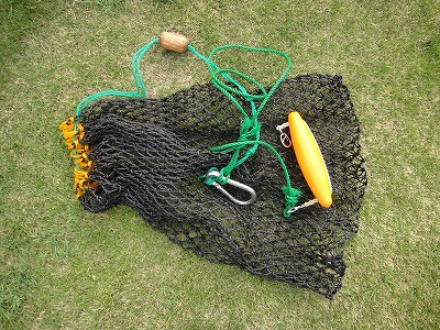 | おとり缶流出防止 | おとり缶の流出防止に磯釣り餌入れの網袋を利用しています。 小さい石でもしっかり詰めれば、流れに合わせた重石ができます。フロートを付けておけば一晩浸けておく際、急な増水に会っても安心です。 |