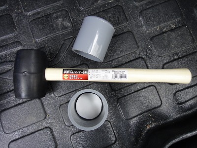竿の固着で困ったことは有りませんか?以前固着してしまったときに、釣具店へ持っていき専用の道具で簡単に外してもらいました。その時の道具と要領を見ていて自分で作ってみました。排水用配管のキャップ(VP50用)の中に樹脂まな板をカットして接着、それとゴムハンマーを車載しています。竿を平らに置いてキャップを当てまっすぐに叩けば簡単に外れる・・・ハズ!まだ試したことが有りません。だれか使って! | ![]() |