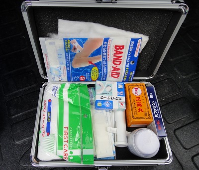 | くすり箱 | くすり箱も常に車載しています。スペアタイヤの隙間に入れてあります。絆創膏、正露丸、バファリン、ガーゼ、包帯、それとハチ刺され用にポイズンリムーバー(毒吸出し器)など。必要な時には声を掛けてください。 | ![]() |
