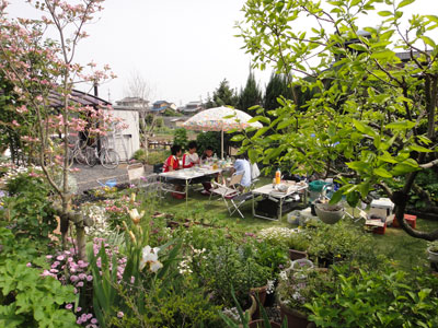 今年はハナミズキも沢山花を付けました。年によってほとんど花が付かないこともあります。鈴鹿では花木生産が盛ん(東名阪鈴鹿インター付近に沢山生産農家があります。)で、このハナミズキも生産者の方から頂いたものです。家まで来て植えてもらったものなのでさすがに元気です。左画像パラソルに隠れていますが、白も植えてあるので紅白になっています。 |