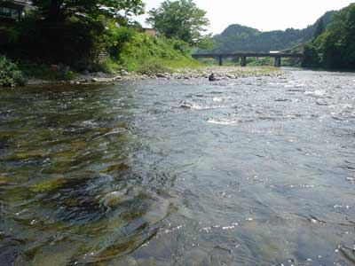 HPを見ていただいているsilverdaddyさんから、よい所がありますよ、と少し前に教えてもらい、ずっと気になっていたので食いつきの良い夏は川漁師さんを誘って行ってきました。ポイント名としては「長瀬」と言います。場所は新美濃橋から板取川方面に上り、最初の新長瀬橋の手前を右岸沿いに入ります。少し行くと堰堤上に旧の橋があり、たもとに「橋元屋」さんというおとり屋さんがあります。こちらでおとり(31,000円)を購入し、前の駐車場に停めさせてもらいます。ここからは徒歩でポイントまで200mほど。道はありますが細いため付近は一切駐車禁止です。堰堤上は水泳場になる大きなトロ、ポイントの上は穴洞の下から続く広大なトロでこのタンクにはどれだけ鮎が居るの?と言った感じです。