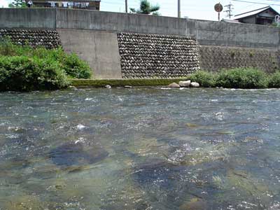 8時半ころ開始。まずは波立ちのある瀬の開きからです。1匹目出し掛かり、泳がせるとポツポツの掛かり。対岸の護岸からサンダル履きでやってる地元の方は瀬で良く掛けています。サイズは瀬でも開きでも変わらない様子。今回は瀬でもしっかり泳がせようと細糸です。メタルの0.03ですがかなり強い。午後だんごになってしまった時に切れるまでノントラブル。さすがに良く泳いで午前中は25匹。1箇所で23匹続く感じ。木陰で昼休憩。水泳場ではビキニの似合う子たちが沢山いて最高のロケーション?BBQをしていた外人さんにステーキをたらふく頂き長めの休憩を終え13時半午後の部開始。上の瀬からゆっくり攻めながら下までを釣りくだり、1往復でしたが午後は32匹。4時頃からは上飛ばしできれば掛かる感じでした。サイズも午前中よりUP!沢山釣れましたが「知らないうちに掛かった」状態が無く全て明確な当たりで掛かる最高の状態。今回は掛かり鮎に変えて最初の送り出しを正面に出すのではなく、しもへ送り出して横に、そして上らせるようにしました。正面に出すとぐんぐん上ったり、沖へ出たりしてコントロールし難くなるからです。本当はナイロンでこれを上手くコントロール出来れば強力な武器になるんでしょうけど。腕の未熟さは細糸がかなりカバーしてくれます。今回は下竿で吊り下げるような操作で良く掛かりました。元気なときは正面で、上らなくなったら下で、のパターンが効きました。ここの所大会続きでヘトヘトになる釣りばかり。特に根尾川大会は決勝での釣りが段々悔しくなってきてもやもやしていましたが、今回久しぶりにスカッとする釣りができました。アクセスが面倒なので地元の人が多く穴場です。但しここは専用区ではありませんので81日からは網が入ってしまいます。今回はsilverdaddyさんのおかげです。皆さんに楽しんでもらえれば良いですよ!と神のようなお言葉。ということでネットでも公開させてもらいました。網まであと僅か!皆さん早く行きましょう!