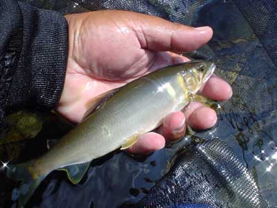 やや早い流れ。細糸効果テキメン! 遡上物でしょうか。平均的サイズです。ほとんどの鮎がこのような戦闘状態でした。