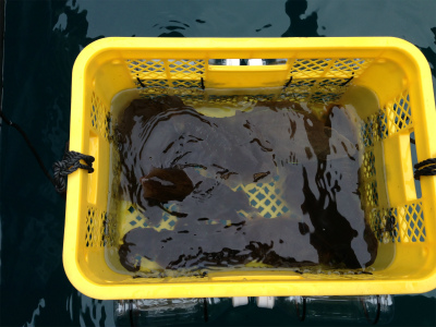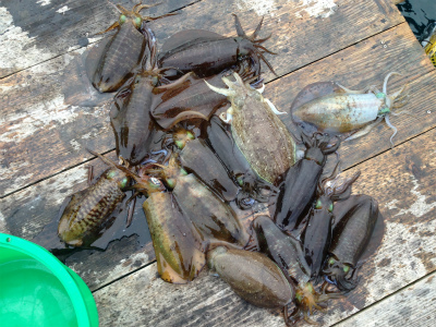 昨年調子が良かった阿曽浦の裕丸(ひろまる)さんの筏は、1月、2月はイセエビ漁場などの関係もあり休業。3月1日がスタートです。年末に予約して、3月まで長いなあと思っていましたが、あっという間の2か月でした。この日は低気圧が近づくためだんだん荒れてきそうですが、暖かい曇天の凪で絶好のイカ日和。満員のお客さんを乗せて出発。波はないもののうねりがあります。筏周辺にはベイトが沢山。それを狙う小さいアオリも見えます。ロープ際には40p近い良型のグレが多数!これはアオリも釣れそうです。1投目、テトラ方向へ。付いてくるが小さい。反対の深いほうへ。着底を確認して大きくしゃくるとガツン!大きいアオリ特有の最初は根掛かりかと感じさせる手ごたえ。重量感たっぷりで上がってきました!ロックフィッシュならぬ「ロック」です。アユでもアオリでも「岩」を釣り上げると恥ずかしいですね!岩は筏に飾ってもう一度。生命感がない感じ。数投目、2杯付いています。使っていたエギはシマノエギザイル 3.5DEEP パープル/ケイムラですが、手を出しそうで出さない。サイトでエギを変え反応を見ます。“トビツキ”はアオリーQのマーブルサクラダイでした。もう廃版のようですが大好きなエギの一つです。沈下姿勢が良いようで、フリーフォールで威力を発揮!使うのは4号です。この日は結局このエギが良く、14杯中12杯を取りました。また、今までの感覚だと良型は底でガツンとくる場合が多かったのですが、この日は底(水深20m〜25m)では反応薄い。10m辺りが良く当たりました。フォールの途中でステイさせて5〜10秒待つとラインが横に走ったり、チョンと触ったり、ラインがふけたりする当たりを取って掛かりました。午後からはだんだんとうねりが強くなってきてベイトも見えなくなり反応が落ちたのでカワハギを少し狙いましたが無反応。2時半上がりにしました。釣果はアオリが14杯、コウイカが2杯でした。もっと厳しいかな、と思っていたので上出来です。ほかの筏でもよく上がっていたので裕丸さんのHPでご確認ください。1投げで5杯付いてくるときもあってアオリは多いようですよ。